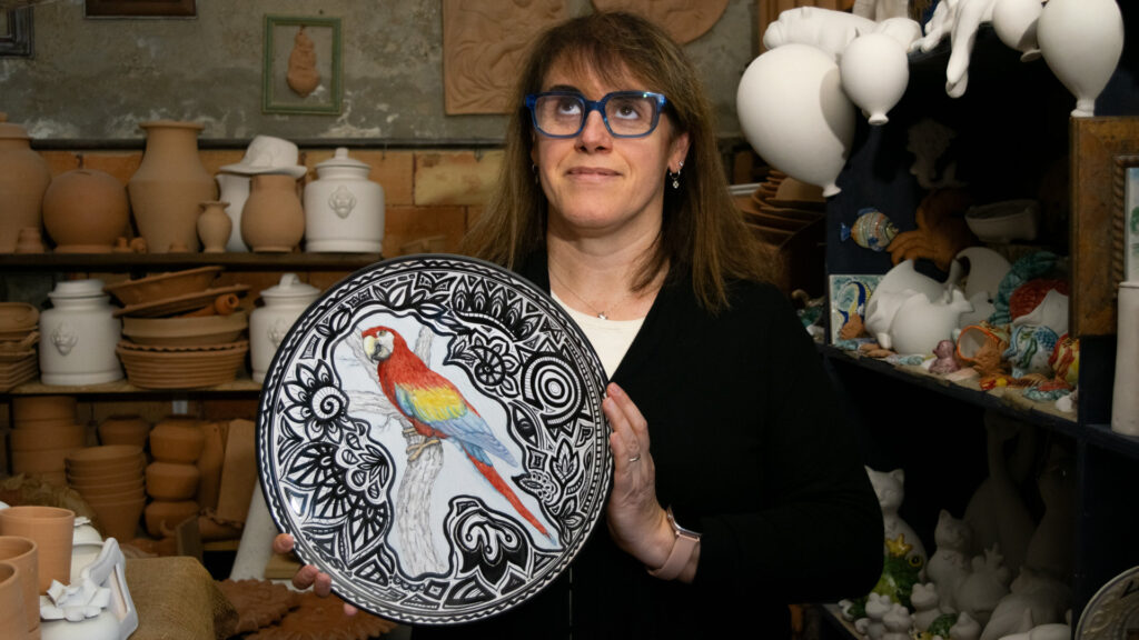 Nel laboratorio di ceramica artistica ogni fase della lavorazione della maiolica viene eseguita da Morena con maestria, dalla modellatzione dell’argilla con utensili e tornio, dalla decorazione, fino alla cottura finale.